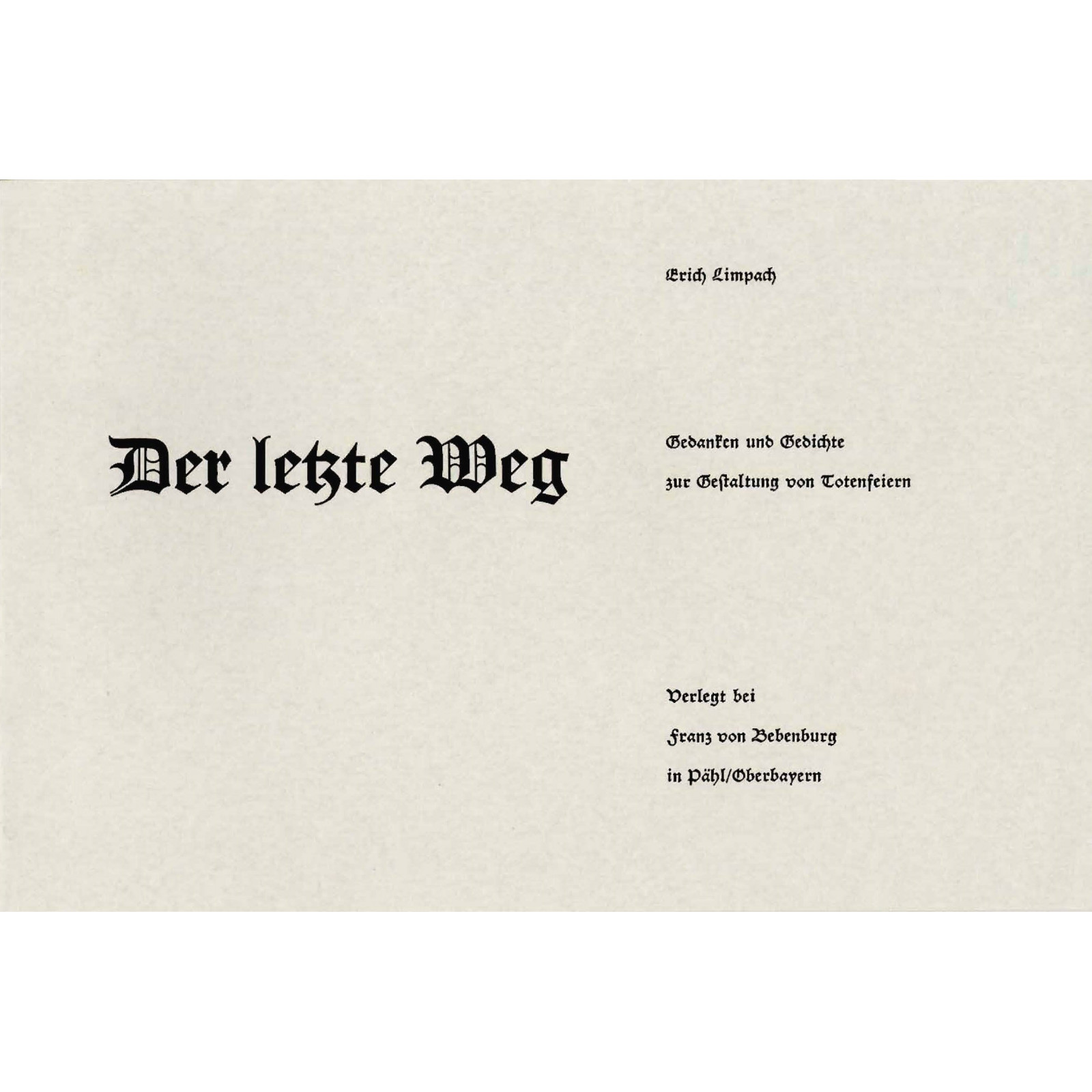 Diese Zusammenstellung ist ein Versuch, der Eigengestaltung von Totenfeiern zu Hilfe zu kommen. Das verdichtete Wort hat sich dabei als das sinnvolle Hilfsmittel erwiesen, weil es unschwer von einem Hinterbliebenen oder von einem Freunde am Grabe gesprochen werden kann. In rechter Verbindung mit Musik und Lied wahrt es die Weihe, der die Kürze zusätzlich dienlich ist. 16 Seiten im Querformat