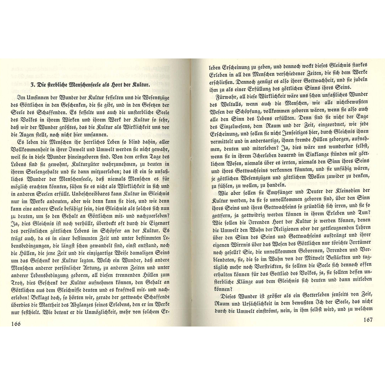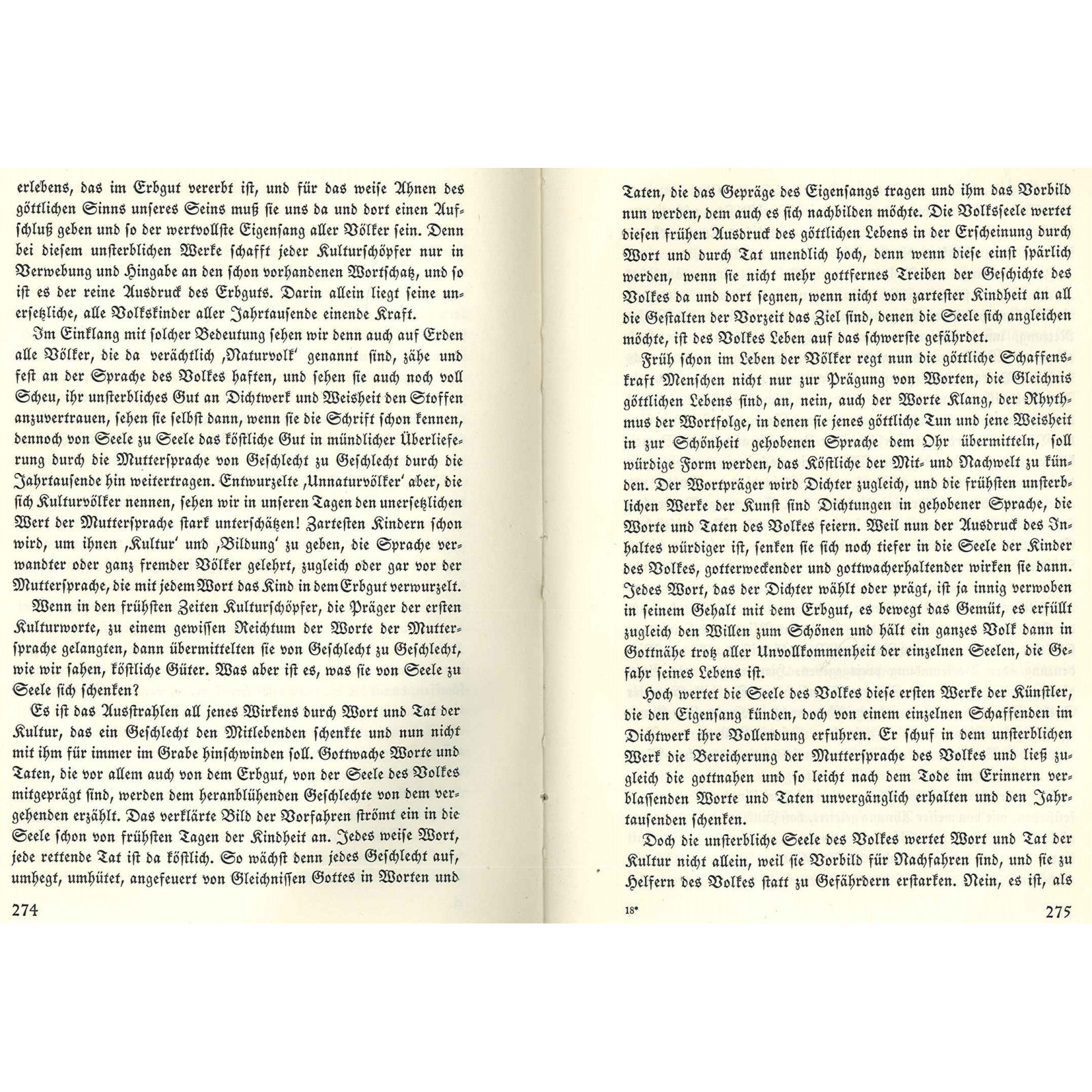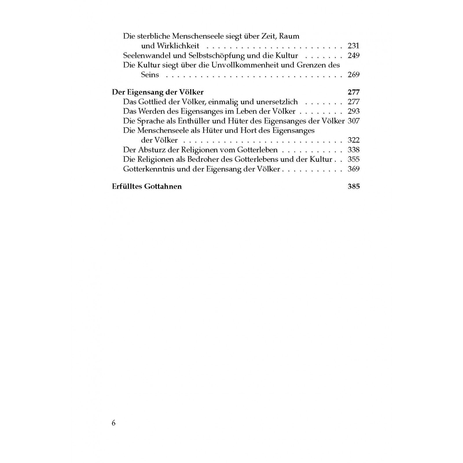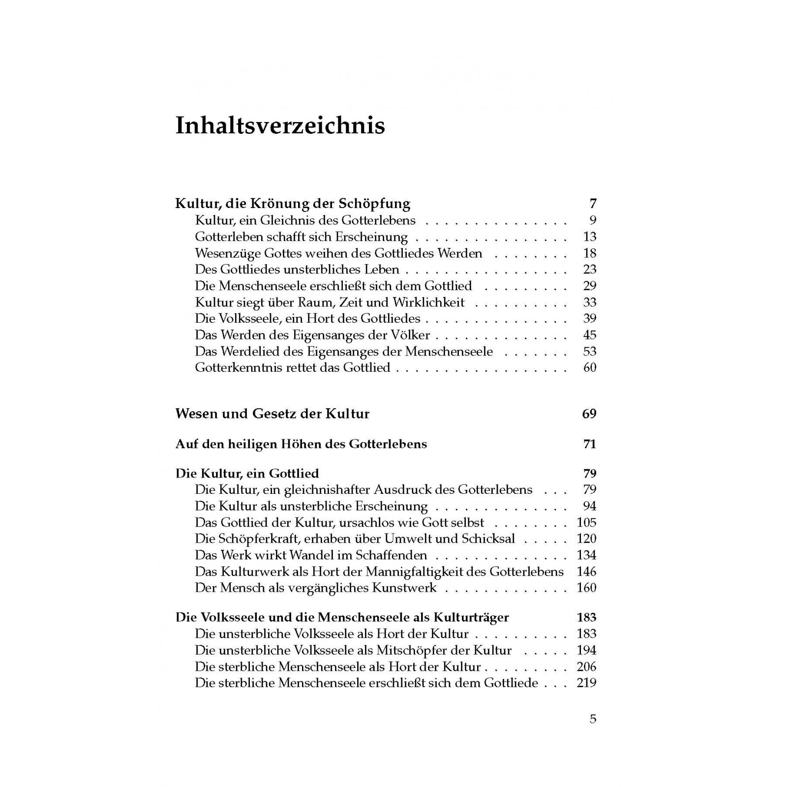 Das Werk ist in packender Sprache gestaltet. Wir erleben das Werden der Kultur. Alle in diesem Sammelbegriff enthaltenen Teilbegriffe, wie Sprache, Musik, Kunst, Dichtung und Wissenschaft, klingen hier harmonisch zusammen. Die Einzigartigkeit dieser Kultur bei jedem Volk und jeder Rasse verwebt sich zu einer herrlichen Melodie und schenkt den Angehörigen jeden Volkes tiefstes Erleben in ihrer Seele. Im Zusammenklang aller Kulturen entsteht so wahrlich ein Gottlied der Völker! Wir erkennen die geheimnisvolle Schöpferkraft, die sich im Künstler regt, die ihn zum Schaffen treibt und zum Gestalter der Kultur werden läßt. Wir sehen, wie das göttliche Erleben die sterbliche Menschenseele Zeit, Raum und Wirklichkeit besiegen läßt und alle Unvollkommenheit und Grenzen des Seins zu überwinden befähigt. Das seelische Erleben beim Schöpfer des Kulturwerks und beim wiedergebenden Künstler führt uns zur Erkenntnis des Einzigartigen und Unersetzlichen der Kulturen für die Völker. Zum ersten Male ist die unersetzliche und unantastbare seelische Eigenart aller Rassen und ihrer Völker klar an Tatsachen ihrer Kulturen erwiesen. In unantastbarer Klarheit wird erwiesen, wie der Reichtum der Völker und ihrer Kulturen den göttlichen Sinn der Schöpfung vollendet. Daraus ergibt sich eine Achtung jeden Volkes und die Verantwortung, nicht nur das eigene Volk zu erhalten und ihm seine Selbstbestimmung zu sichern, sondern auch für diese Rechte anderer Völker einzutreten. Damit ist jeder Imperialismus als schöpfungswidrig erkannt. Und damit ist dieses Werk zeitlos wesentlich und gerade für unsere Zeit von außerordentlicher Tragweite. Seiten