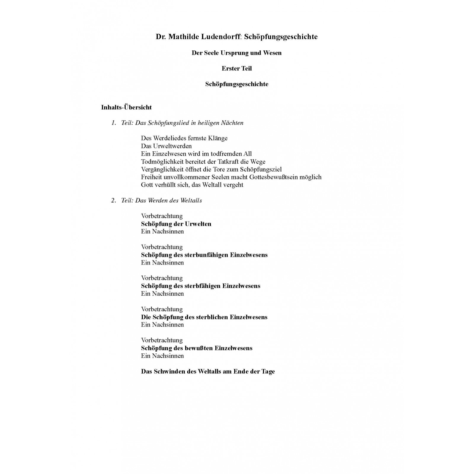 In Ihrem zweiten Hauptwerk "Der Seele Ursprung und Wesen" behandelt Mathilde Ludendorff eingehend die Voraussetzungen und die Art des Gotterlebens in der Menschenseele, überhaupt alle Grundgesetze der Seele der Lebewesen. Ihre Seelenlehre beginnt mit dem ersten Teil Schöpfungsgeschichte. Die ganze Schöpfung ist Vorstufe der Seele gewesen. Wer ihre Krönung, die Menschenseele, begreifen will, der muß zuvor die anderen Schöpfungsstufen, beim Äther und Urnebel angefangen, erfassen. Die Seele des Menschen ist der Mikrokosmos, in dem sich alle Schöpfungsstufen des Makrokosmos noch einmal wiederfinden. Sie schafft den bewußten Kosmos in sich. Sie ist nicht wesensgetrennt von der unbewußten Zellseele und der unterbewußten Tierseele, sondern umfaßt sie beide in sich, bereichert durch das Erleben der Bewußtheit. In diesem Werk vereinigt sich höchste Philosophie und Religion mit Naturwissenschaft, um uns Menschen über uns selbst hinausgelangen zu lassen. Alle ungelösten Rätsel der Seelengesetze werden von dem klaren Lichte der Grunderkenntnis aus in wundervoller Übereinstimmung mit allen Tatsachen der Erfahrung und der Wissenschaft begreiflich gemacht. Da es für alle Zeiten für viele die Beweiskraft dieser gewaltigen philosophischen Schau erhöht, begrüßen wir die Tatsache, daß die Philosophin die Vorstufe zum ersten Lebewesen, die die Naturwissenschaft vergeblich gesucht hatte, verkündet und beschrieben hat, und daß vierzehn Jahre nach dem Ersterscheinen des Werkes (1923) die Naturwissenschaft den von der Philosophin benannten und beschriebenen Eiweiß oder Kolloidkristall fand! Im Frühjahr 1939 ward zu dem Werk die Dichtung geschaffen "Das Schöpfungslied in heiligen Nächten", die nunmehr als erster Teil das Werk noch unendlich bereichert! Wie schon im Werk "Triumph des Unsterblichkeitwillens" die Dichtung "Wie es die Seele erlebte" dank der dichterischen Schönheit der Gestaltung den reichen Erkenntnisgehalt dem Menschen tief ergreifend übermittelt, so erst recht hier, wo vom Wesen Gottes aus das Werden des Alls erschaut und in dichterischer Schönheit dem Leser geschenkt ist. Eine weitere Bereicherung das Werkes sind die künstlerischen Zeichnungen von Lina Richter, die die wesentlichsten Schöpfungsstufen in künstlerischer Vollendung und dabei in wissenschaftlicher Treue darstellen. 154 Seiten