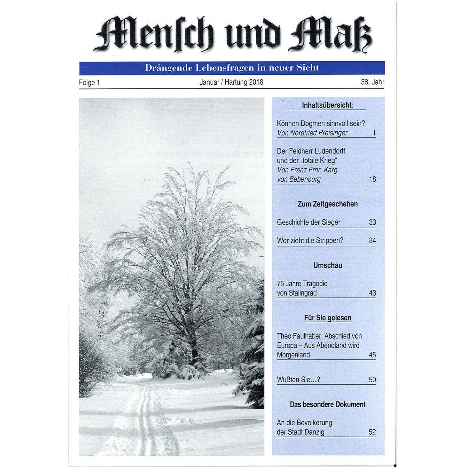 Die Monatszeitschrift „Mensch und Maß“ 52 Seiten, erscheint im Verlag Hohe Warte GmbH, Pähl. Verantwortlich: Wolfgang Peetz, Gränertstraße 15,...